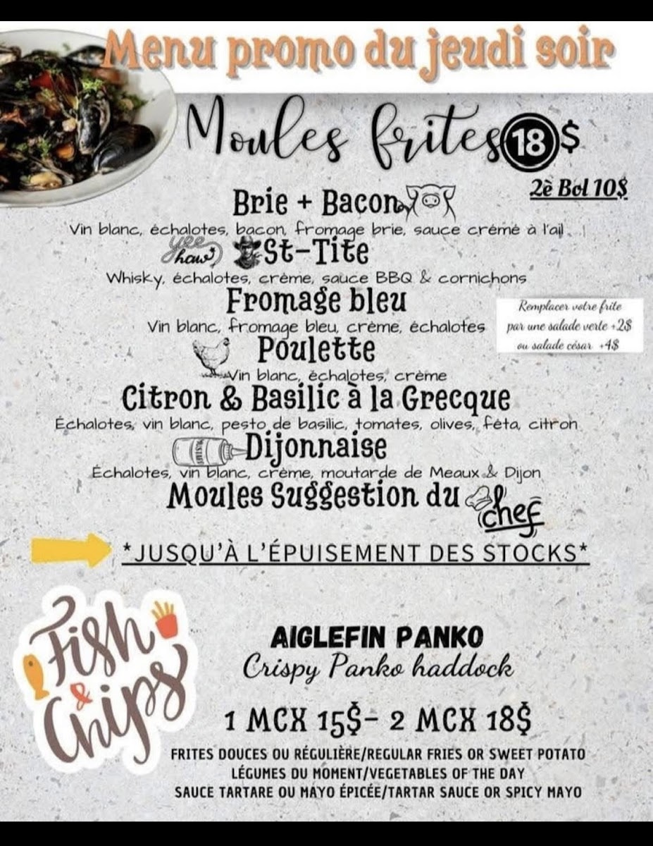 On Fridays, indulge in the special Salmon Tartare, complete with fries and maple salad for CA$28.00. For those who save room for dessert, choices like Crème Brûlée and Mousse au Chocolat beckon, each priced at just CA$5.00!